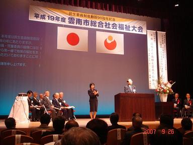 各種表彰の後・・「民生児童委員創設90周年記念事業」として 雲南市民生児童委員協議会・槙原冨徳会長の意見発表。大変なお仕事です。これからもよろしく・・です。