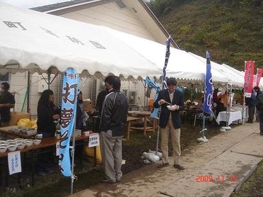 市議会議場前の駐車場には所狭しとテントが張られ いろいろ出店されています。「豚汁 どうぞどうぞ!!」。早速頂戴いたしました・・美味しかったです。