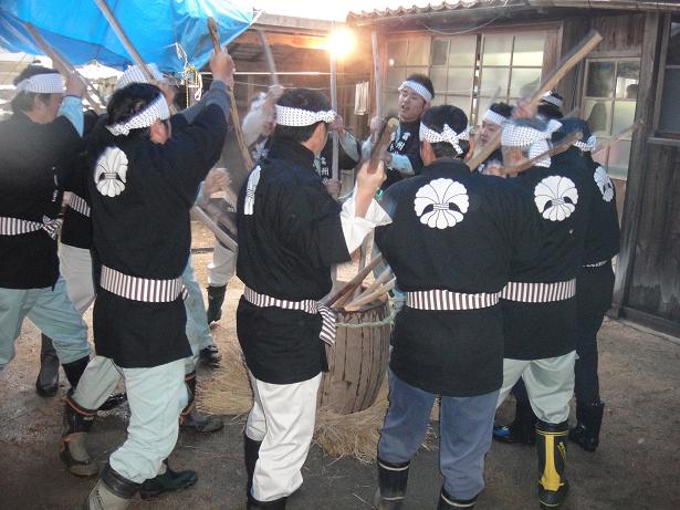 唄に合わせて徐々に・・ワッショイ・わっしょい・・のかけ声と共に 臼の周りを激しくぶつかりながら 搗き上げて行きます。熱気が伝わるでしょうか・・。