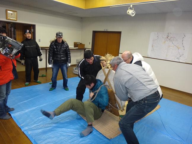 午後一番 場所を 善福寺境内の観音堂に移して 伝統行事 餅さし大会。今年は 雲南夢ネットに加えて 天下のNHK さんも加わり盛り上がっています。(写真は品川御大作品・・・会場に華・・)