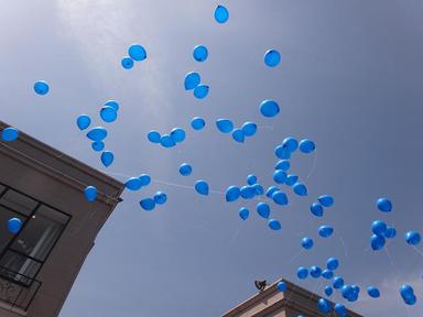 外の芝生で 風船を空に・・・青空に 青い風船・・・。
