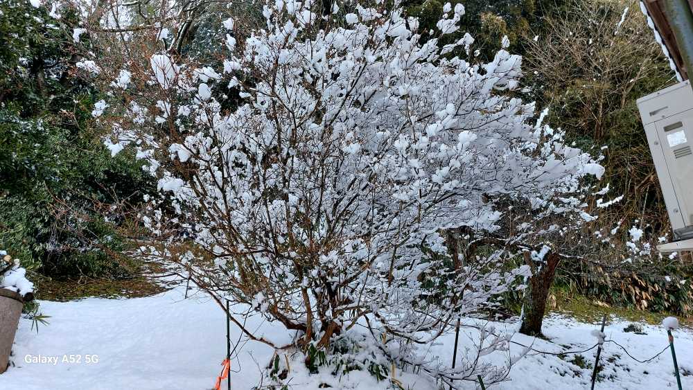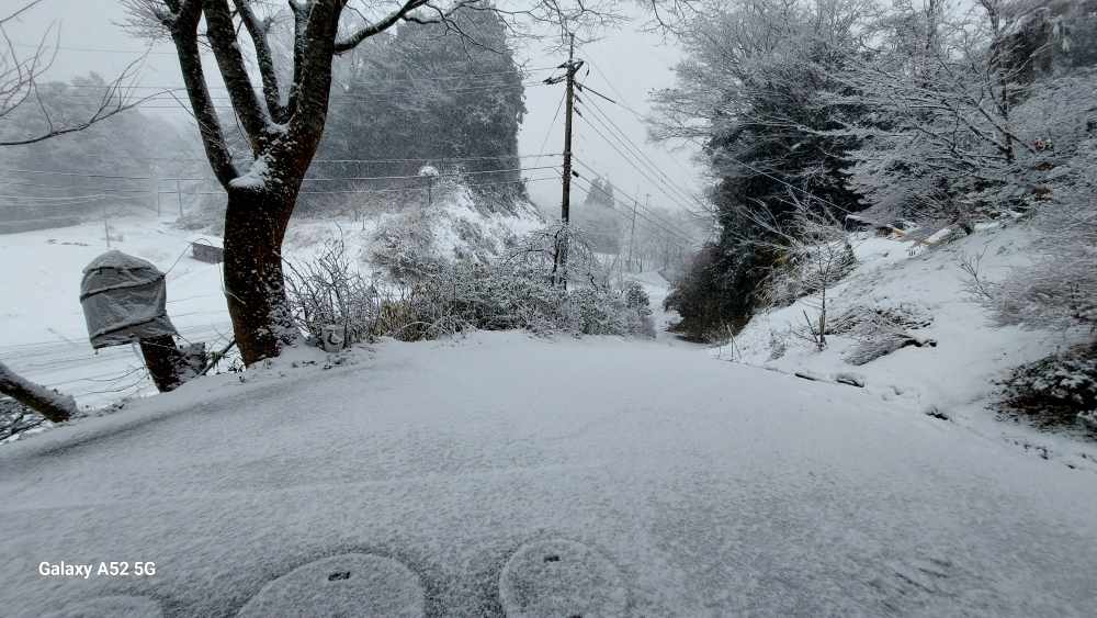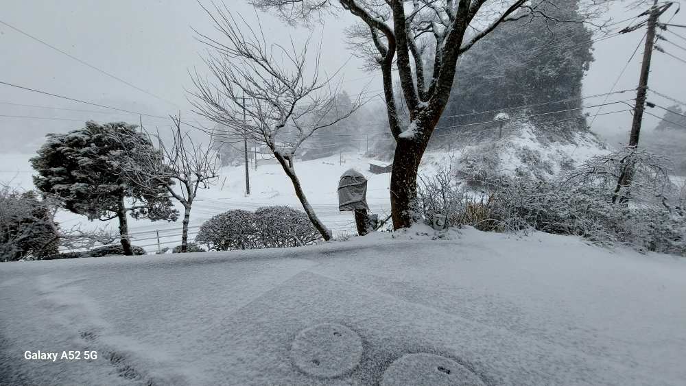 出かける頃 前が白くなるほど 降ってきました。こりゃ あちこち 積もるわ・・。門の坂もあっという間に白くなりました。出口の所の倒木を昨日 伐っておいて良かったですわ。
