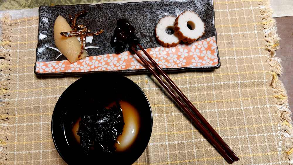 朝食は お雑煮・・十六島海苔を掛けて・・。小皿には 数の子 からんま 煮豆 野焼き・・。