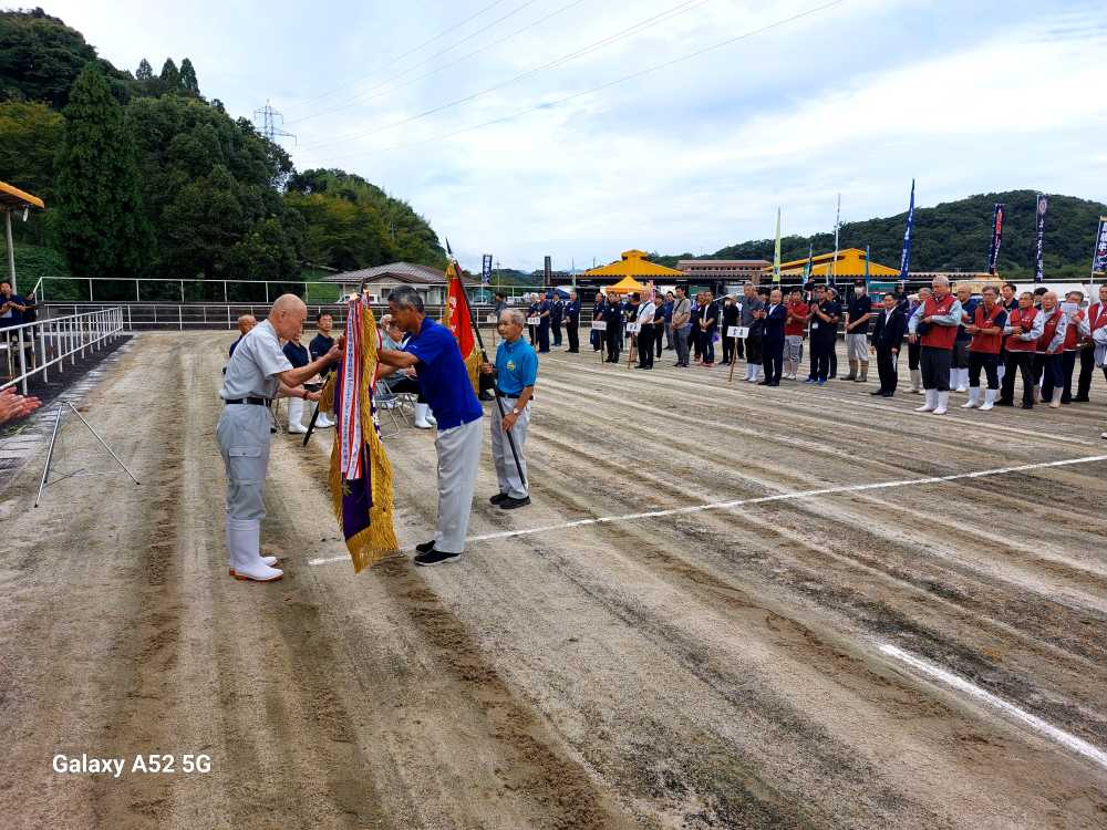 朝8時半開会 上記会場にはたくさんの車と人・ひと・・。にぎやかです。各 市・町の幟端が立っていました。