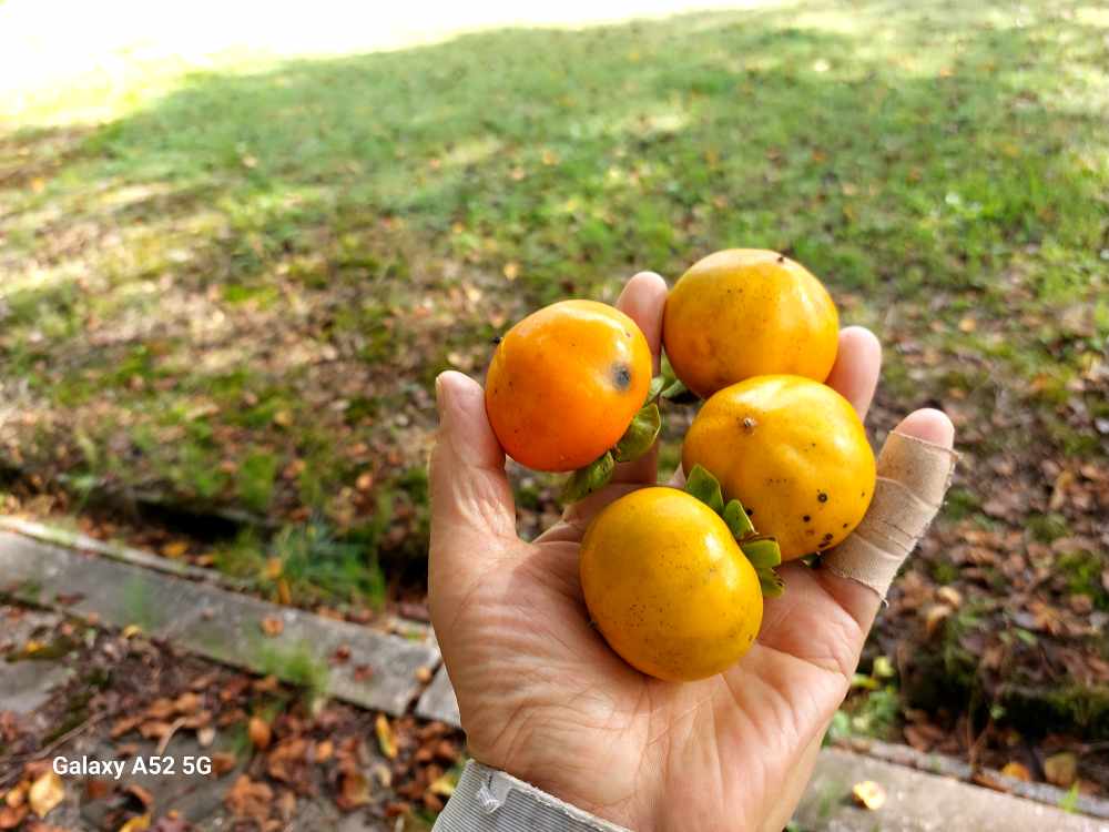 我が家周辺で 秋の香り・・。ザがき(柿)でしょうか・・。食べてみると甘柿。