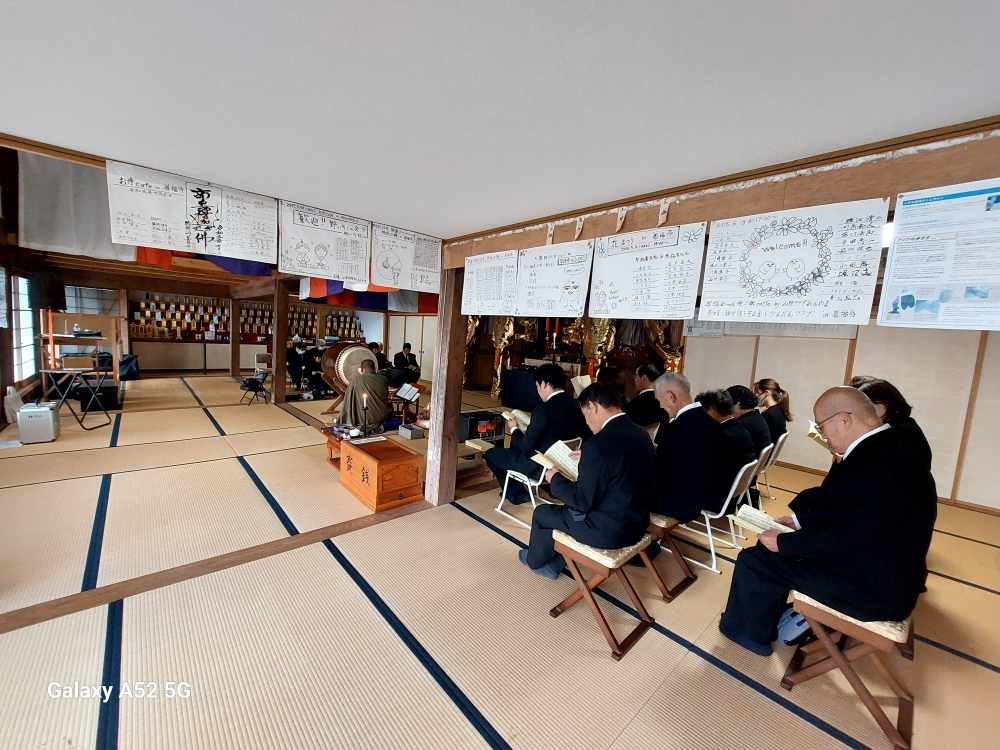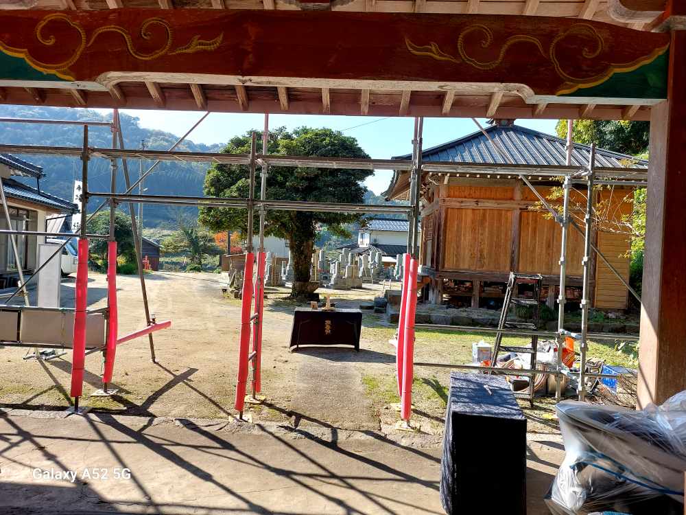 葬儀会場 善福寺で 張り場 の設置。葬儀は午後ですが 朝から香典を持参される人もあり お寺で留守番でした。今 善福寺の屋根の塗り替えで 足場が組まれています。