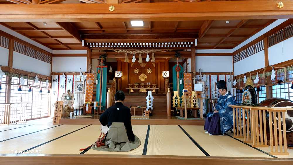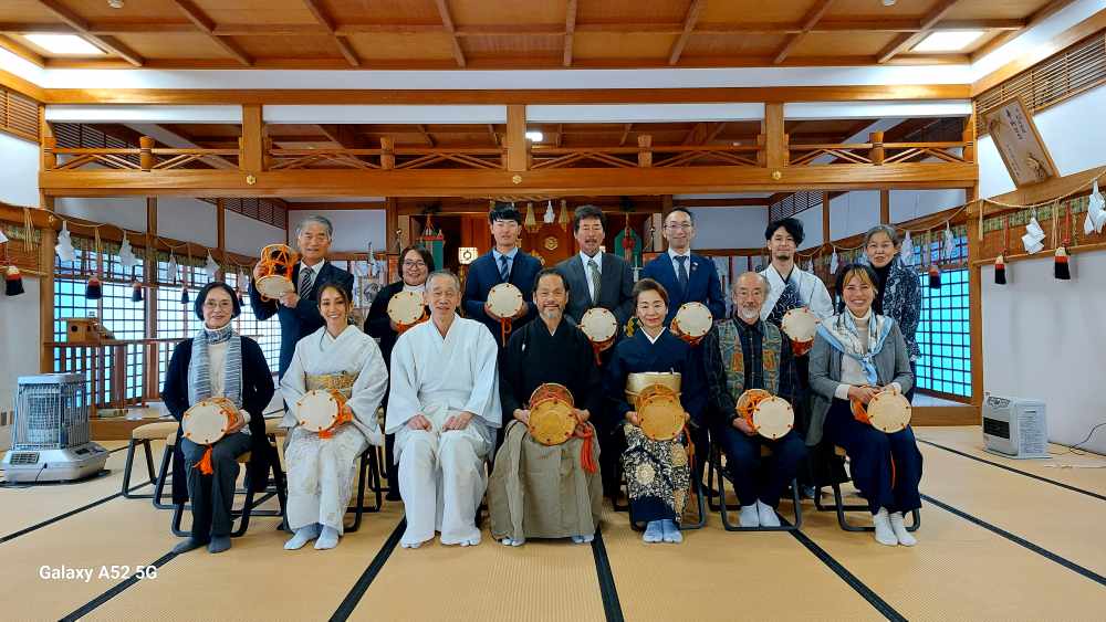 続いて 参加者全員で 合奏・・なかなか いい音が出ませんが みんなで渡れば・・です。ありがたい初体験でした。感謝!!。2礼4拍手1拝・・。ありがとうございました。一期一会・・國造さまと一緒に記念撮影でした。