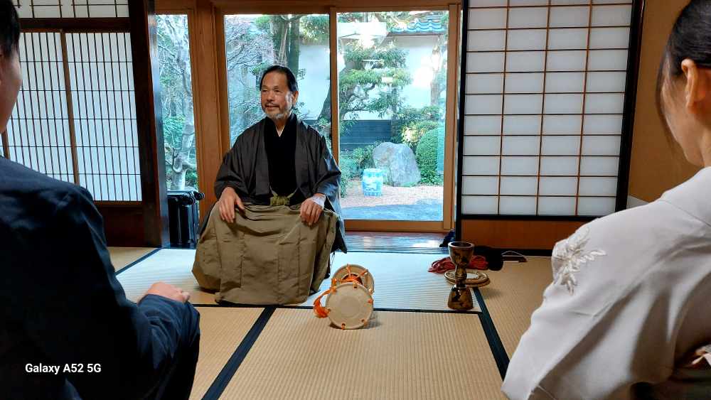 手銭家で大鼓の練習・・先生の指導で・・「よ~‥トン(息を吸って・・)よ~~トン・・」「よ・とん・よ・トン・・」。息を合わせることが肝要です。