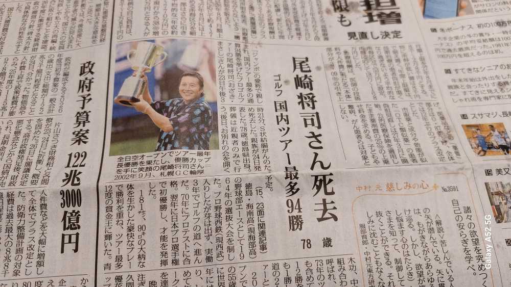 昨日 書くべきところでした・・今朝の新聞の一面に出ていました。昨日 検査で待合室の どこかのテレビに尾崎選手が写っていました。年末でゴルフの特集でもしているのかな?・・と思って居ました。訃報だったんですね・・。