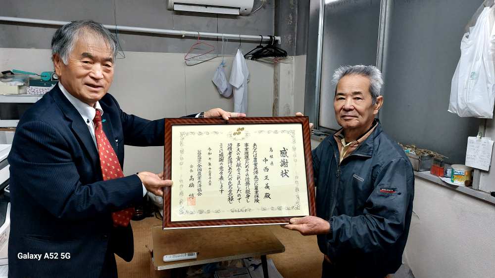 帰り 先日のNOSAI全国大会で表彰された 中西評価会会長に 伝達に行ってきました。長年に渡ってご尽力を頂いています。これからもよろしくお願いをいたします。