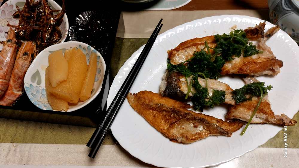 夕食・・昨日 いただいた スズキ の ムニエル・・骨の周りですが「余すところなくいただいたわね!!」と云うことでした。だんだんだんだん 漁師さん。