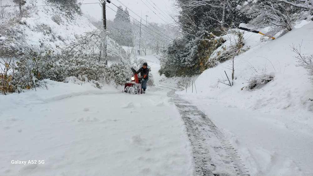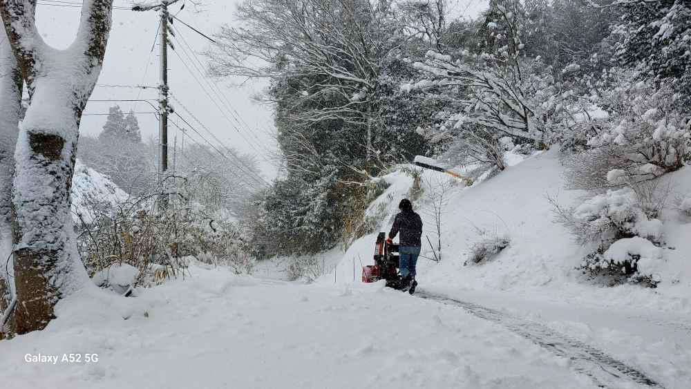 我が家でも 門ん坂を掻いておかんと 「車が出られんようになるがね!」と 早速 除雪車を 動かしていました。だんだん・だんだん・・。(この担当も かみさんで・・)
