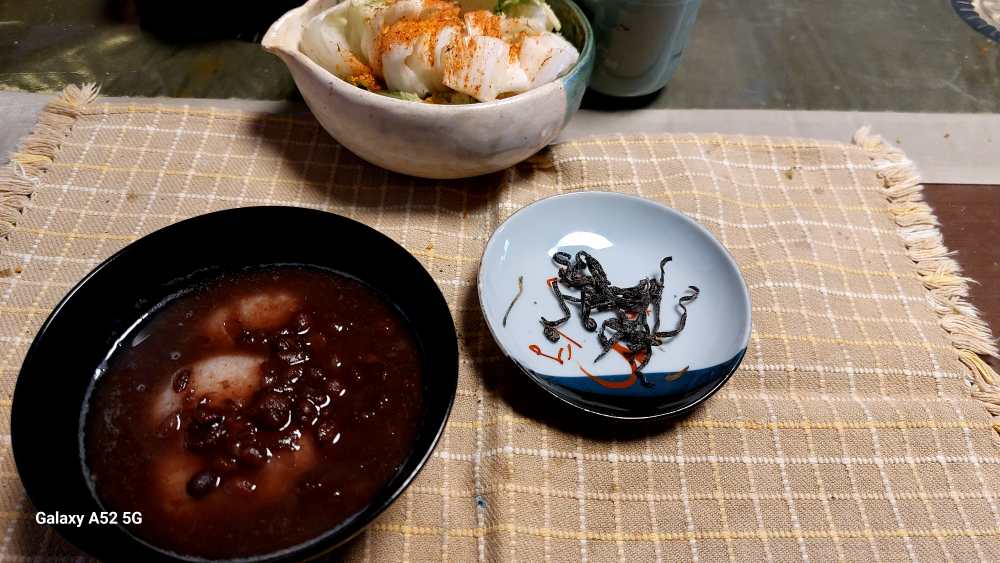 今朝はうっすらと雪が積もっていました・・。「今朝は小豆雑煮だよ・・」と云うことで・・・。「小豆雑煮は松江の方で食べられるけどね・・」と云うことのようですが 「珍しいものをよばれまして・・」。