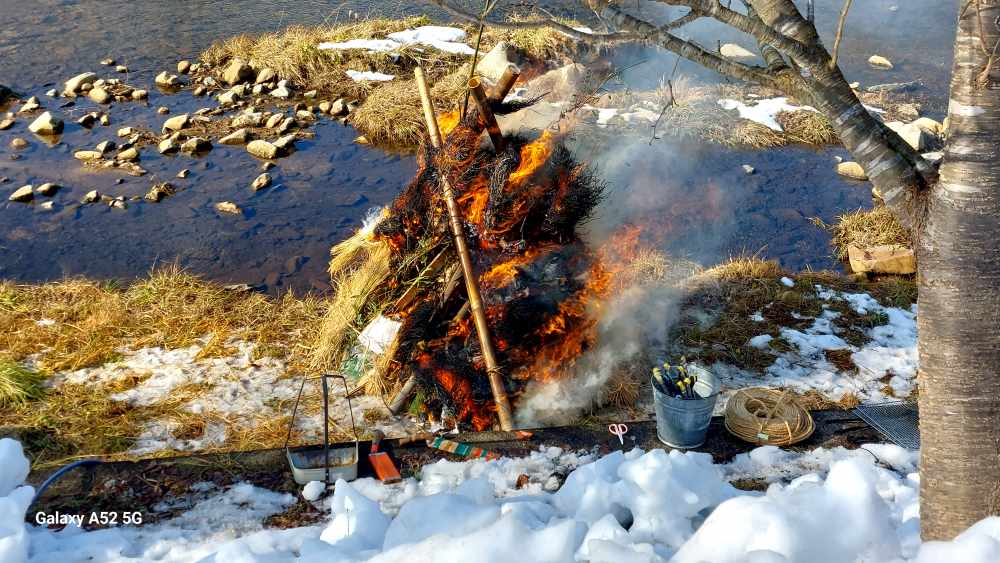 川辺にすでに設置されたトンドさん‥大きなトンドさんでした。定刻に 「点けるぞ!」という合図で点火。風が少しでて 会長さん 心配そうでした・・。