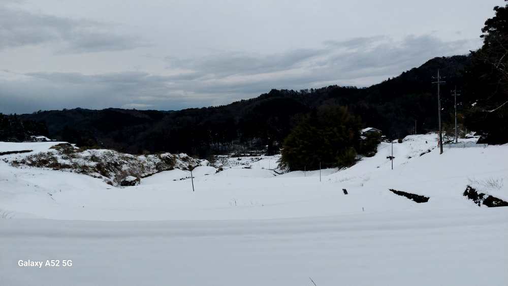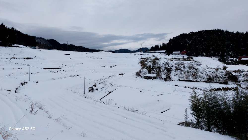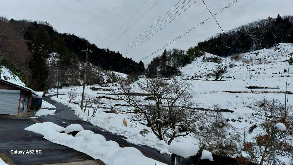 夕方 久々に集落の一部を歩いてきました。ほんと久々でした・・女鹿山(めがやま)周辺・・こちらも まだ一面白ですね・・。天空の棚田もまだまだ 雪景色・・。