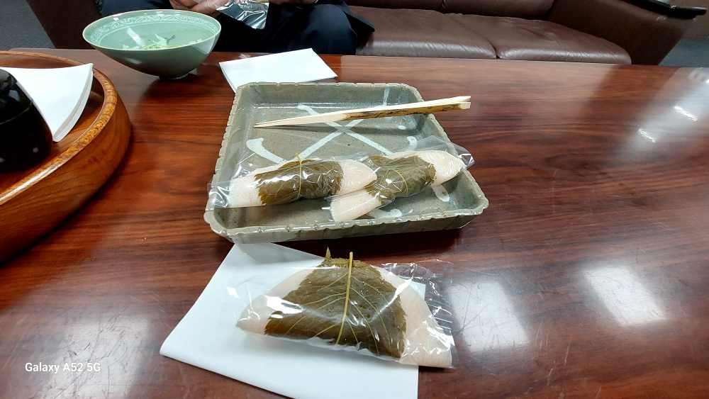 午後 「水稲評価会」。益田 石見 東部 出雲雲南から 代表のみなさまにお集まりいただきました。新春初会合でもあり うちの 「表千家の准教授」に お茶を点てていただき お点前を頂戴してスタートでした。お菓子は 雲州平田の名店 岡本堂の 桜餅・・・。ちょっと豪華なお茶席でした。だんだんでした。