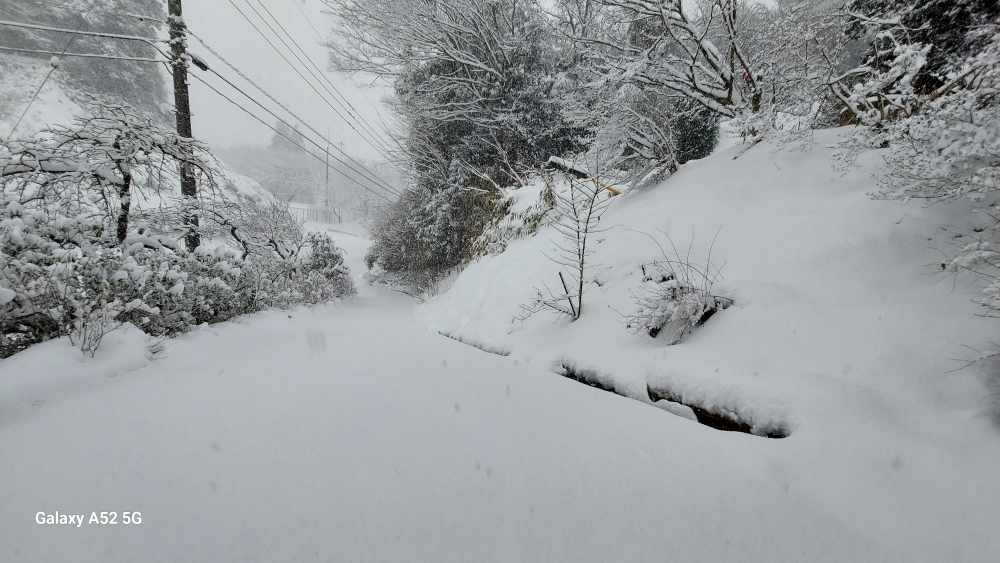 昨夜から降っていました。ま 大したことないわ‥と外を見ると結構な勢いで降っていました。車庫の前の木戸坂は 5~10センチは積もっていたでしょうか・・。