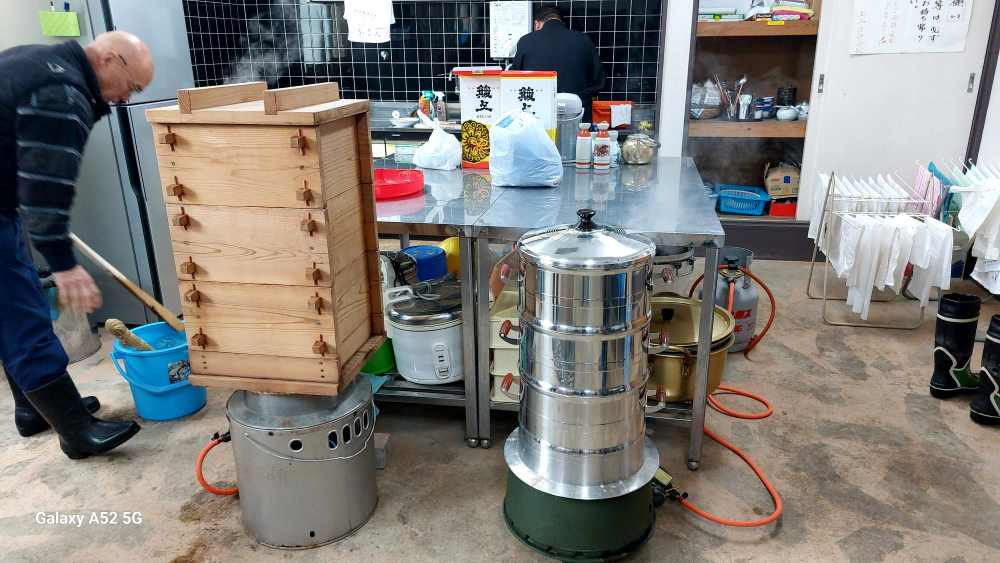 本日午後から 上山伝統行事 餅さし用の餅つきが行われ 少し遅れて お邪魔しました。すでに 仏事も終わり もち米が蒸されている最中でした。