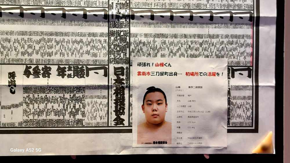 帰り 市役所によってきました。これまでいろいろお世話になった職員さんとも遭遇。今日もお世話になりました。山根君の番付表がありました。来場所は頑張ってほしいですね。